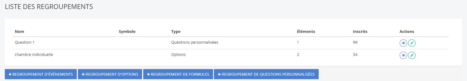 Le regroupement de formules permet d’avoir une vue globale des inscrits dans les différentes formules, indépendamment du rattachement des inscrits à tel ou tel événement fils.