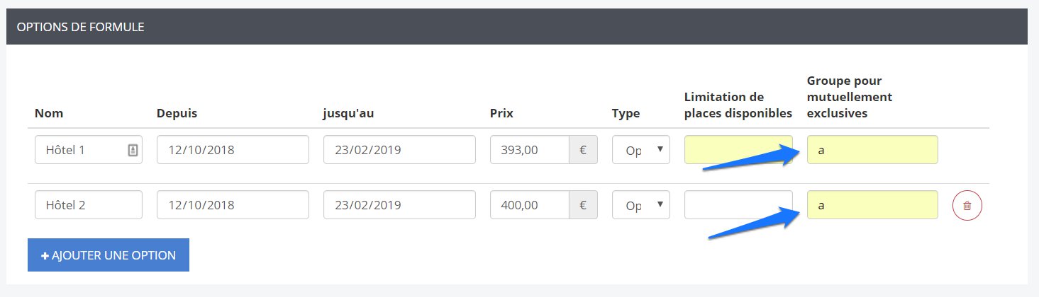 Pour configurer les options mutuellement exclusives, il faut indiquer la même lettre minuscule dans le champ à droite. Lorsqu’on s’inscrit, on ne peut bien choisir qu’une seule option, parmi celles qui sont mutuellement exclusives.